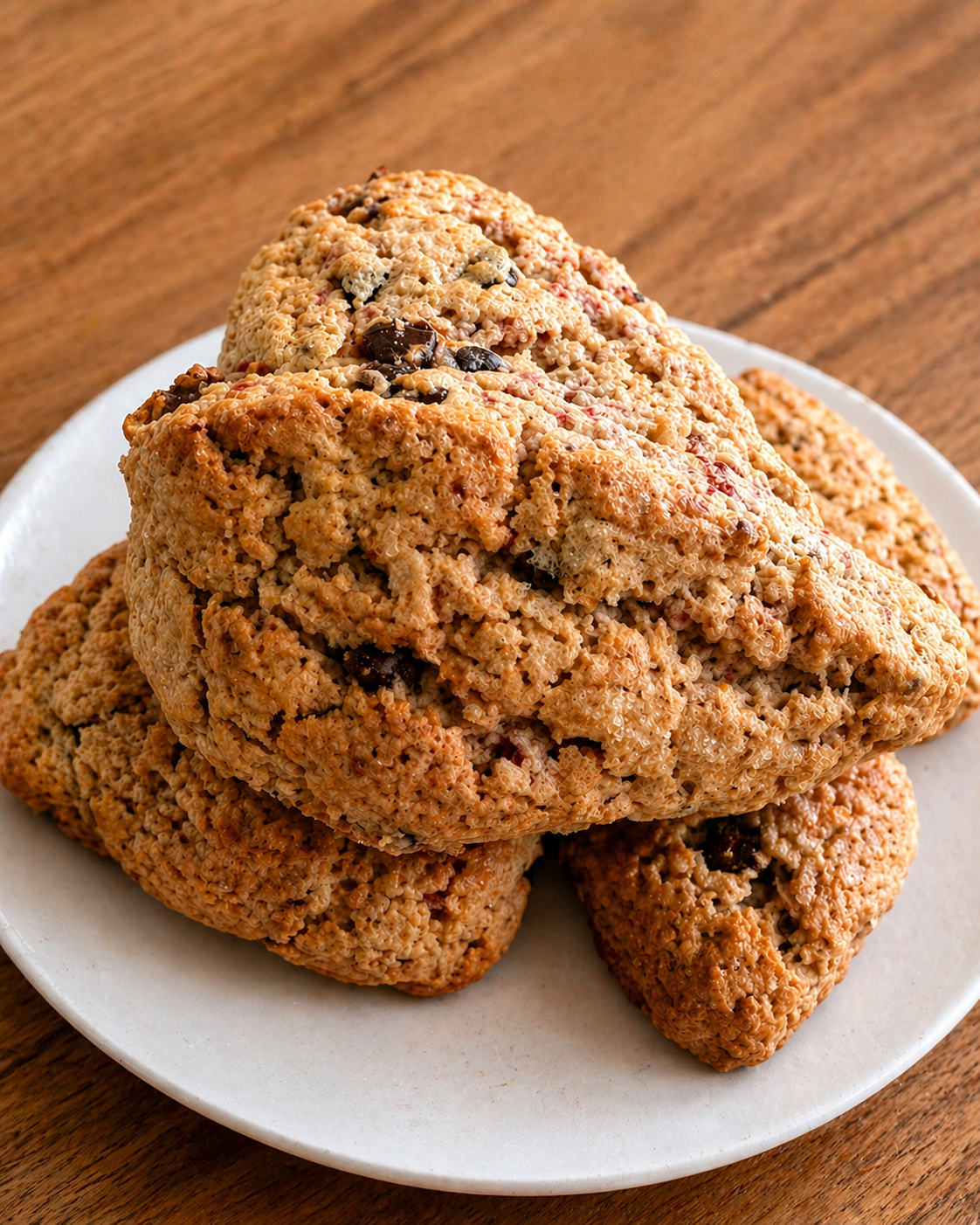 Tender, buttery sourdough scones made with crushed freeze-dried strawberries for a naturally vibrant flavor and finished with pockets of semi-sweet chocolate chips. Lightly crisp on the outside and soft in the center, each scone is hand-shaped and baked fresh in small batches for that classic bakery-style texture.